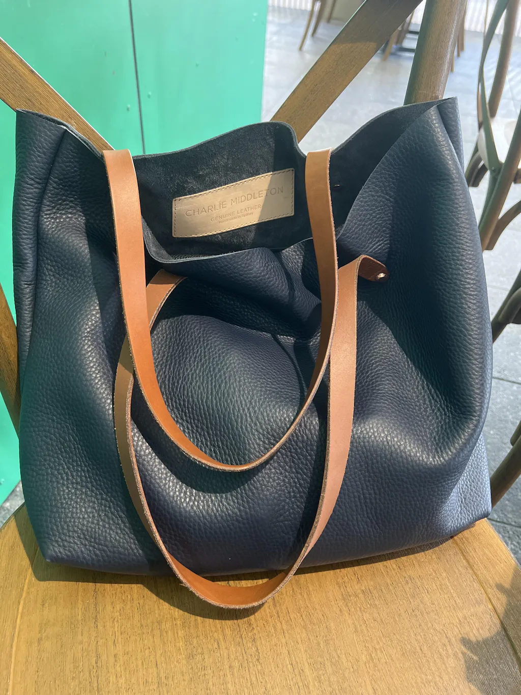 It’s made from our buttery-soft Navy Nappa Japanese cowhide, and comfortably fits a 15” laptop.